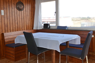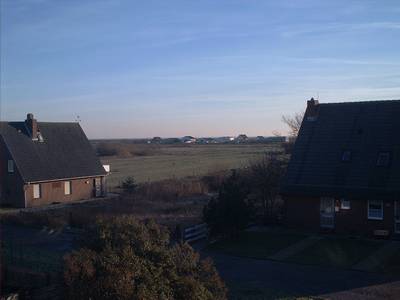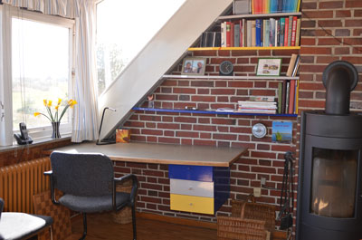 auf einer bequemen Treppe nach oben und betritt den 25 qm großen Wohnraum. Das 5 m breite Fenster liegt nach Osten, so dass man von der Eßecke, in der auch viel gespielt wird, und vom Schreibtisch aus einen weiten Blick über Dünen und Wattwiesen hat. |