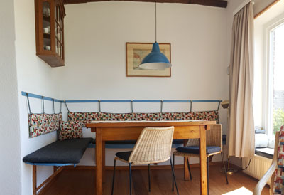 Eß- und Spieltisch mit der Eckbank hat sich als sehr nützlich erwiesen und ist oft der meistgenutzte Teil des Raumes. Die Mitte des Raumes aber ist der Kachelofen. Trotz Zentralheizung ist seine besondere Wärme an kühlen Tagen sehr beliebt. Mit dem neuen Einsatz hält er die Glut auch wieder über Nacht und kann dann morgens einfach weiterbrennen. |