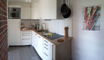 Für Menschen die gerne kochen haben wir die Küche mit Spülmaschine und Abluft eingerichtet. Geschirr, Besteck und Hausrat ist reichlich vor-handen, scharfe Messer, ordentliche Töpfe und Pfannen sind selbstverständlich. Einen Grundstock an Gewürzen, Tee, Kaffee, usw. finden Sie bei der Anreise bestimmt vor und lassen es auch für Ihre Nachfolger gerne wieder stehen. |