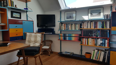 besonderen Charakter bekommt der Raum durch das Atelierfenster im Dach, das noch einmal die Abendsonne hereinfallen läßt. Darunter befindet sich auch die Medienecke: Schreibtisch mit WLan, ein gut gefülltes Bücherregal, CD, Kassette, Radio und der Fernseher mit DVD Spieler, dazu die Filmbibliothek der 'Süddeutschen Zeitung'. |