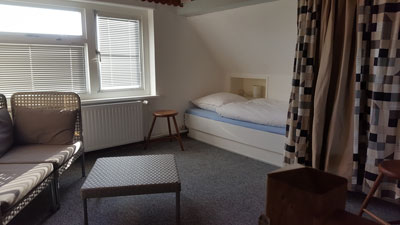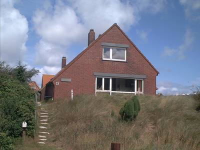 Das Vorderhaus wurde 1958, nach den Erfahrungen vieler Inselsommer, zunächst als schmales Haus alleine oben auf die Düne gebaut. Die Terrasse und das 4 m breite Fenster gehen nach Süden, so hat man - nicht nur von der Ofenbank aus - einen weiten Ausblick. Man betritt das Haus durch einen Vorraum, von dem aus man das Bad, die Toilette und den großen Wohnraum erreicht. |